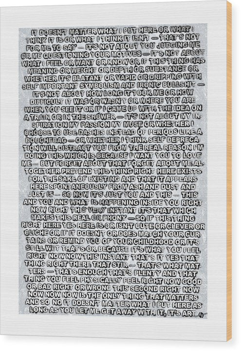 Artist's Statement wood print by Tony Rubino. Bring your artwork to life with the texture and added depth of a wood print. Your image gets printed directly onto a sheet of 3/4" thick maple wood. There are D-clips on the back of the print for mounting it to your wall using mounting hooks and nails (included).